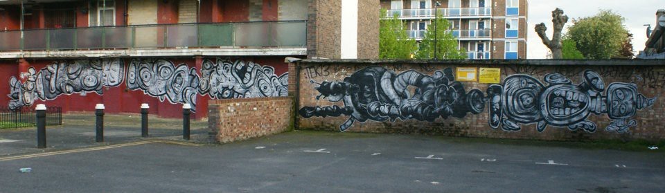 Artist Nazir Tanbouli created The King's Land mural project on the site of the condemned Kingsland Estate in Haggerston. Covering all of the derelict buildings in hand-drawn murals, the artist crafted the most extensive single-artist mural project ever in the UK. Filmmaker Gillian McIver made the documentary Taking Over the King's Land about the project, and the two artists ran the Studio 75 Gallery.